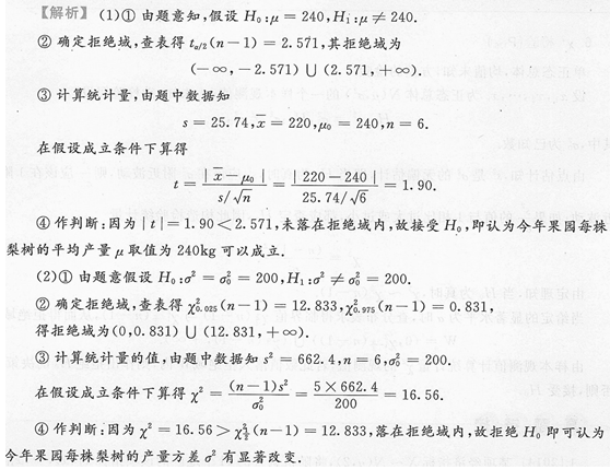 已知某果园每株梨树的产量X(kg)服从正态分布N(240,σ2),今年雨量有些偏少,在收获季节从果园一片梨树林中随机抽取6株,测算其平均产量为220kg,产量方差为662. 4kg,试在检验水平ɑ=0.05下,检验(1)今年果园每株梨树的平均产量μ的取值为240kg能否成立;(2)若设X~N(240,200),能否认为今年果园每株梨树的产量的方差万σ2有显著改变?(u0.025=1.96,u0.05=1.645,t0.025(5)=2.571,χ20.025(5)=12.833,χ20.975(5)=0.831)