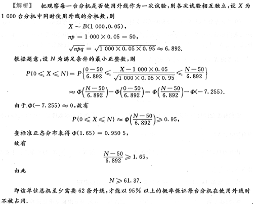 设某单位内部有1 000台电话分机,每台分机有5%的时间使用外线通话,假定各个分机是否使用外线是相互独立的,该单位总机至少需要安装多少条外线,才能以95%以上的概率保证每台分机需要使用外线时不被占用?