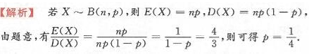 一个二项分布的随机变量,其期望与方差之比为4/3,则该分布的参数P=___________。