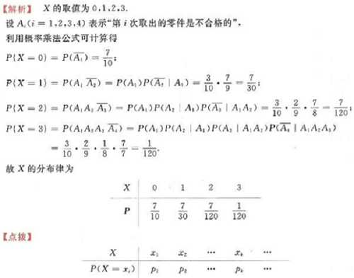已知一批零件共10个,其中有3个不合格,现任取一件使用,若取到不合格零件,则丢弃,再重新抽取一个,如此下去,试求取到合格零件之前取出的不合格零件个数X的分布律.