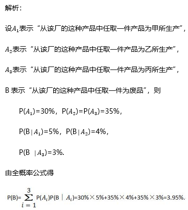 在某工厂中有甲、乙、丙三台机器生产同一型号的产品,它们的产量各占30%,35%,35%,并且在各自的产品中废品率分别为5%,4%,3%,求从该厂的这种产品中任取一件是废品的概率。