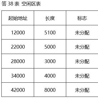 假设系统在时刻10:00的已分配区表如题38-1表所示,空闲区表如题38-2表所示。