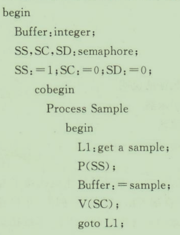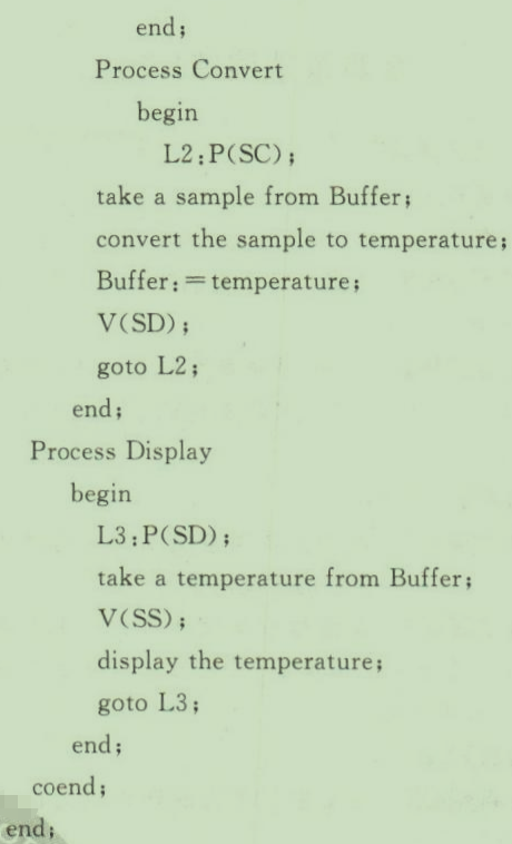 在测温系统中要完成采样、转换和显示等任务。釆样过程把从传感器上得到的整型微电压值存入一个缓冲区,转换过程把微电压值从缓冲区中取出,计算转换成温度值再存入该缓冲区,显示过程把缓冲区中的温度值取出并显示。试用P、V操作实现三个过程共享缓冲区的同步问题。