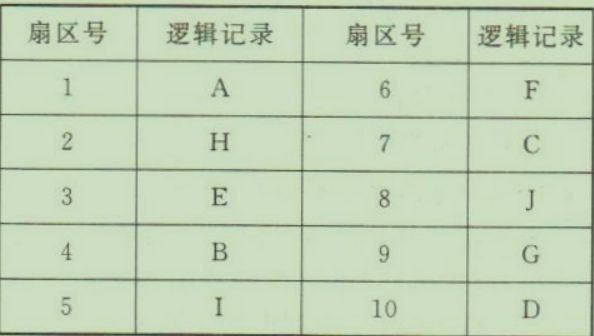 (2)重新安排这10个逻辑记录,使得处理程序读出一个记录并处理结束时正好使下一个记录能旋转到磁头位置下,那么,处理程序不必等待。处理程序每读出一个记录并处理后就能立即读出下一个记录来处理,这样,处理这10个逻辑记录花费的时间最短。10个逻辑记录的安排可如下调整: