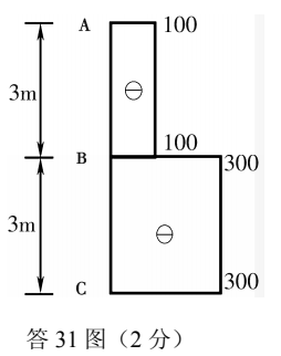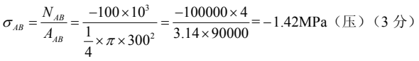 (1)做轴力图(答31图),求轴力在圆柱的分布,NAB=-100kN(压)。NBC=-300kN(压)