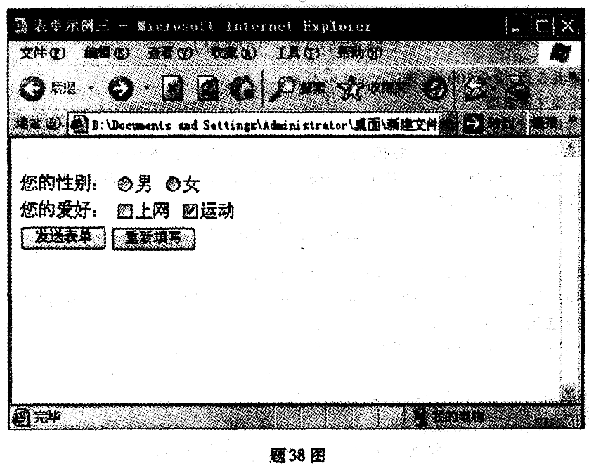 根据下图写出HTML文档源代码。要求:①显示标题为“表单示例三”②使用单选框实现选择“您的性别”功能;③使用复选框实现选择“您的爱好”,默认选中“运动”的功能;④添加“发送表单伊和“重新填写“两个功能按钮。