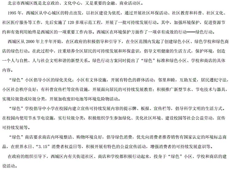 1.社区是指以一定地域为基础的社会生活共同 体。社区发展指在城乡基层社区中社区居民 依靠社区自身力量,在政府和其他组织机构 的支持下,推动社区有计划地进行社会变迁, 改善社区的经济、社会和文化状况,提髙社区 居民的生活质量。社区建设就是以人们日常 居住和生活的基层社区为载体,通过社区居 民自治,社医与政府、企业和其他社会组织共 同合作,来建立一个与现代社会保障体系、现 代城市管理制度和社会化服务网络相适应的 社区支持系统。2.北京市西城区的绿色行动,充分体现了现代 社会社E建设和社E发展的理念。从社区的 全方位建设人手,用可持续发展思想指导社区的各项工作,充分动员了各类社E主体和 社区力量(包括政府、社会组织、学校、商店、 企业以及群众)共同建设自己的社区,发挥了 社会各界的积极性,体现了社区建设工作的 综合性、社会性、区域性和计划性。而且“绿 色”行动具体活动内容的选择,贴近现实需 要,便于群众參与,使社区居民、学生、工作人 员和消费者都意识到可持续发展和环境保护 的重要性,井能够“从我做起、从小事做起”, 投身于可持续发展事业。“绿色”行动由于政 府的推动カ度大,公众参与广泛,可操作性 强,具有较高的参考价值。它的意义不仅在 于使当地居民可持续发展的意识大幅度提 高,改善了西城区的生活环境,取得了很好的 社会效益,更重要的是为城市社E的可持续 发展探索了一条有价值的发展模式,是我国 大城市可持续发展社区建设很好的示范。
