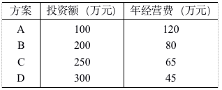 某项目拟定了四个方案,都能满足相同的需要(如下表),设基准收益率为12%,请用静态差额投资收益率法选择最优方案。