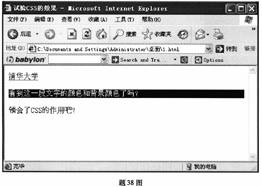 根据下图写出HTML源代码。要求:①使用CSS层叠样式表。②显示标题为“试验CSS的效果”。③实现链接“清华大学”功能,该超级链接为红色。④文字“看到这一段文字的颜色和背景颜色了吗?”的背景色为蓝色,字体为白色。