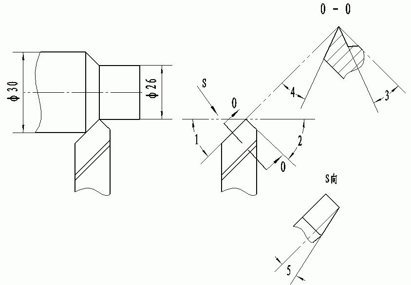 下图为外圆车刀加工圆柱面图。根据图形写出代号为1~5的刀具角度名称和符号。假设机床主轴转速为500转/分钟,根据图中参数计算切削速度和背吃刀量的大小。