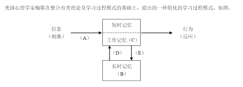 根据梅耶的学习过程模式图,学习者在外界刺激的作用下,首先产生注意(A),通过注意来选择与当前的学习任务有关的信息,忽视其他无关刺激,同时激活长时记忆中的相关的原有知识(B)。新输入的信息进入工作记忆后,学习者找出新信息中所包含的各种内在联系(C),并与激活的原有的信息相联系(D)。最后,被理解了的新知识进入长时记忆中储存起来(E)。在特定的条件下,学习者激活、提取有关信息,通过外在的反应作用于环境。简言之,新信息被学习者注意后,进入短时记忆,同时激活的长时记忆中的相关信息也进入短时记忆。新旧信息相互作用,产生新的意义并储存于长时记忆系统,或者产生外在的反应。