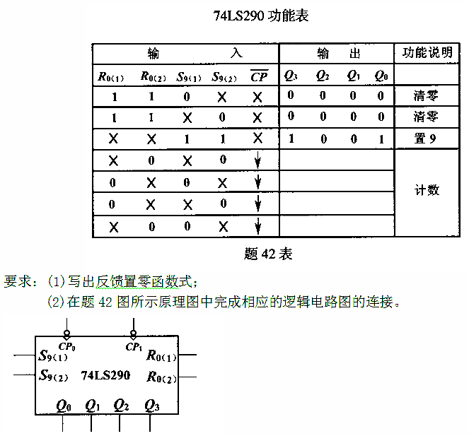 试用1片集成异步十进制计数器74LS290和1个与门电路设计一个七进制计数器,已知74LS290的功能表如题42表所示。