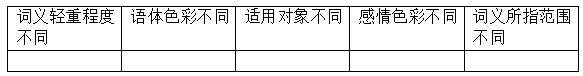 分析下列各组同义词的差异,把序号填入表中相应的空格。考生按下表格式抄写在答题卡上。(1)爱戴——爱护(2)雄辩——诡辩(3)轻视——鄙视(4)边疆——边境(5)母亲——妈妈[图1]