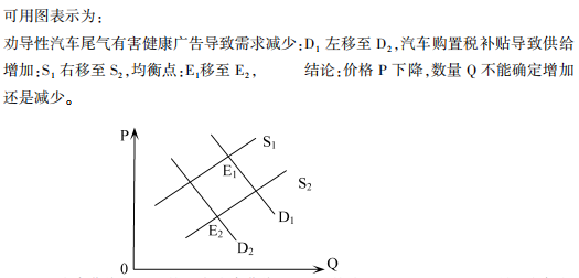 用供求图分析劝导性的“汽车尾气有害健康”广告与汽车购置税补贴政策对汽车市场的不同影响。