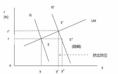 如图,政府推行增加支出的扩张性财政政策,IS曲线移动到IS’,短期内新均衡点为E”,但是由于商品市场上购买产品和劳务的竞争就会加剧,物价就会上涨,在名义货币供给量不变的情况下,实际货币供给量就会因价格上涨而减少,进而使可用于投机动机的货币量m2减少。最终使得均衡点最后回到E’,于是减少的部分Y”—Y’就是挤出效应。