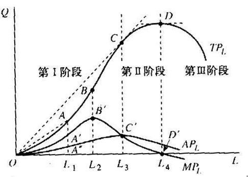 如图,TP是L生产要素的总产出,AP是平均产出,ML是边际产出。