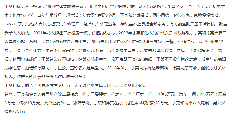 根据法律规定,离婚后父母对子女仍有抚养教育的权利和义务。对两周岁以下的子女,一般随母亲生活,除非母亲患有久治不愈的传染性疾病或其他严重的疾病,子女不宜与之共同生活;或因为母亲不愿尽抚养义务,而父亲要求子女随其生活等其他几种特殊情况。本案中,丁某和徐某的幼女年仅1岁零9个月,徐某的条件也符合法律规定,故应由徐某抚养幼女。 根据法律规定,对10周岁以上的未成年子女,已能判断一定是非,法院在判决时应征求、考虑他们的意见。本案中,丁某和徐某的长子明确表示愿意随母共同生活,徐某也同意抚养,故法院应判长子由徐某抚养。按照法律规定,父母双方条件相同,但子女单独随其祖父母或外祖父母生活多年的,且祖父母、外祖父母有能力照顾利、子女或外孙子女的,可作为子女随父或随母生活的优先条件。本案中,丁某和徐某的长女自幼与祖父母一起生活,其祖父母靠丁某的供养,也有能力照顾她,而且已有两个子女判归徐某,故法院应判由丁某抚养长女。
