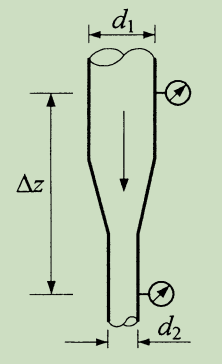 如图所示,变径竖管水流。已知d₁=200mm,d₂=100mm,高差△z=3m,压力表读值相同。若不计水头损失,试求流量。