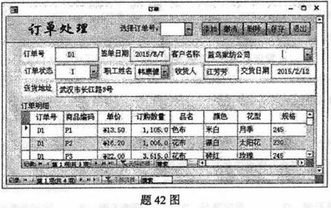 下一篇:创建一个“订单”窗体,如题42图所示,回答下列问题。 (1)指出主窗体和子窗体记录源之间的联系类型。 (2)在“窗体属性表”中,该主窗体和子窗体的“默认视图”属性是什么? (3)在“窗体属性
