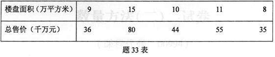 某市房地产投资公司出售的五个楼盘面积与总售价资料如题33表所示: 要求: (1)计算楼盘总面积与总售价之间的相关系数。(3分) (2)建立总售价对楼盘面积的一元线性回归方程。(5分) (3)