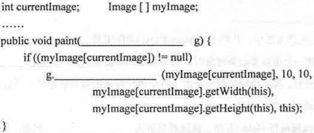 这里给出的是一个播放幻灯片小应用程序的部分代码。设幻灯片已由小应用程序的init()方法装入内存,并存放于mylmage数组中。currentlmage为要显示的幻灯片序号。