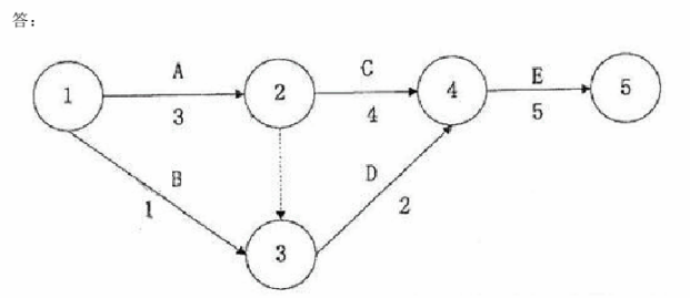 已知某项加工任务共有A、B、C、D、E五道工序,工序之间的关系及工序时间见下表:请用箭线表示绘制网络图,并标注工序名称、时间及节点编号。