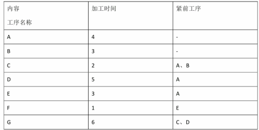 某项目作业共有A、B、C、D、E、F、G七道工序,工序之间的关系及工序时间如表所示: