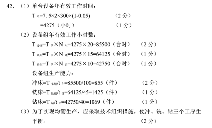 实行两班工作制,每班生产7.小时,设备计划检修率5%(年制度工作日数300天)题42表设备数量与工序台时定额工序名称冲床加工铣床加工钻床加工单位产品台时定额(小时/件)设备名称及数量冲床20台铣床15台钻床10台要求:(1)计算单台设备年有效工作时间;(2)分别计算冲床.铣床.钻床设备组年有效工作时间及生产能力;(3)说明实现均衡生产应采取的措施。
