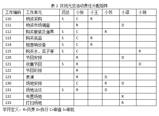 该筹备团队除小张之外,还包括小王、小苏、小梁、小陈4名成员,该活动的发起人是公司总经理吕总。请设计该项目的责任分配矩阵。