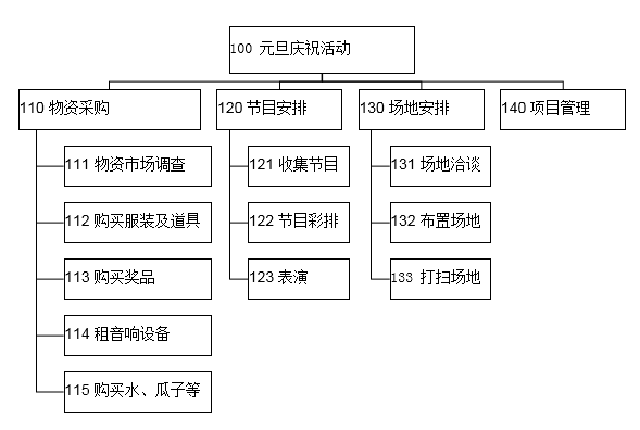 请利用图1所示的形式,制作庆祝元旦活动的工作分解结构图,并在图中进行工作分解结构的编码。