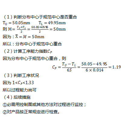 某车床加工机轴,机轴的技术要求为50±0.05mm。若在一定工序生产条件下,随机抽样100件,测得机轴的平均值=50mm,样本标准偏差S为0.014mm。试计算该工序的过程能力指数,并判断工序状况及应采取的后续措施。