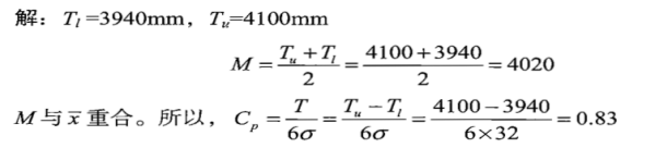 某项目的质量指标要求为:下限为3940mm,上限为4100mm。从50 个测点中测得样本标准差为32mm,均值为4020mm,求工序能力指数。