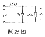 硅稳压二极管组成的稳压电路如题25图所示,已知稳压管的VZ=6v,则U0= _________ V。