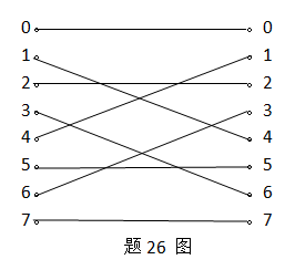 给出N=8的蝶式变换,如图题26图所示。 ⑴写出互连函数关系。 ⑵如果采用omega网络,需几次通过才能完成此变换?