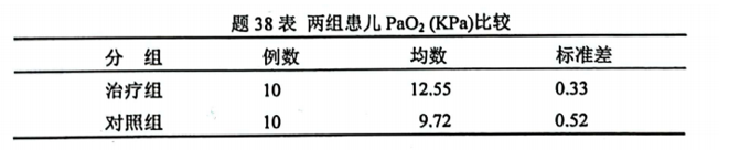 为比较治疗组和对照组的肺表面活性物质PaO2在治疗新生儿呼吸窘迫综合征患儿过程中的作用是否不同,某医生在治疗20名患儿后48小时得到如题38表资料,请分析治疗后48小时,两组的PaO2是否不同。(假设资料服从正 态 性和方差齐性)