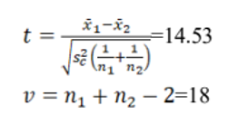 因 t0. 05,18=2. 101,本例 t=14. 53,所以 P0,接受 H1,认为两组的 PaO2不同。