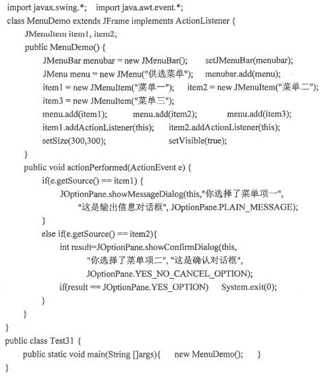 阅读下列程序,请回答以下问题。 (1)程序中共有几个菜单?共有几个菜单项? (2)用户选择“菜单一”菜单项时,程序输出的对话框中有几个图标? (3)用户选择“菜单二”菜单项,并按“是”按钮后,会发生什么情况?
