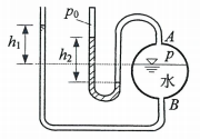 如图所示,锅炉顶部A处装有顶端封闭的U形测压计,底部B处装有测压管。已知测压计项端的绝对压强p₀=0,水银柱高差h₂=80cm,水银的密度ρHg=13.6x10³kg/m³,当地大气压pa=750mmHg,测压管中水的密度ρ=997.2kg/m³,试求锅炉内蒸汽的相对压强p及测压管中的液柱高度h₁。