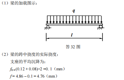 等截面简支梁,受均布荷载作用,在试验中测得两支座处的沉降分别为0.12mm和0.08mm,梁的跨中挠度的测量值为4.86mm。画出梁的加载图式,计算梁中心截面的实际挠度。