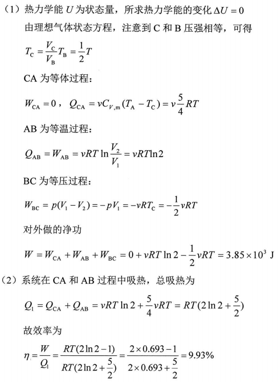 - 物理(工)(00420) - 专业知识收录平台">如图,2mol的双原子分子理想气体进行循环过程,其中AB为等温过程,BC为等压过程,CA为等体过程.设V₂=2V₁,T=600K,计算时取ln2=0.693.求:
