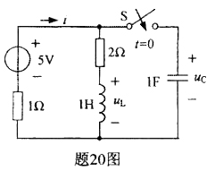 题20图所示电路原已处于稳态,t = 0时开关S闭合,则换路时i、uL和uc中不能跃变的是_________。