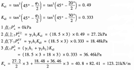 已知一挡土墙高6m,墙背垂直光滑,填土面水平,填土分两层,各层物理力学指标见图所示,计算挡土墙上各分层面上的主动土压力和合力的大小。(不求合力作用点的位置)