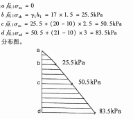计算图中各土层界面处及地下水位处土的自重应力,并绘制分布图。
