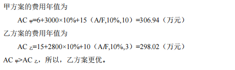 修建某永久工程,经研究有两个方案。甲方案投资3000万元,年维护费用为6万元,每10年要大修一次,需15万元;乙方案投资为2800万元,年维修费用为15万元,每三年小修一次,需10万元。若利率为10%,用费用年值比选两个方案。
