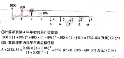 某企业拟建一项目,计划3年建成。与国外某银行商定贷款年利率为8%,复利计息,第1年初贷款1000万元,第2年初贷款800万元,第3年初贷款500万元。第4年末起至第8年末,该企业每年年末等额偿还银行贷款,试问偿还期内每次应偿还多少?(结果保留两位小数)