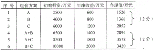 已知三个独立方案A、B、C,寿命均为10年,其现金流量如下表,基准收益率为8%,投资资金限额为10000万兀。试用方案组合法做出最佳投资决策。(结果保留整数)