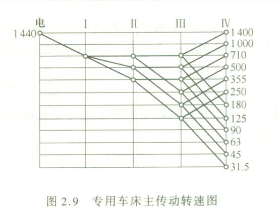 已知某卧式车床的nmax=1400r/min,nmin=31.5r/min, =1.41,n电=1440r/min,试拟定转速图。