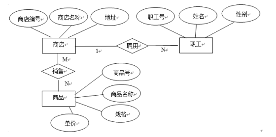 设某商业集团数据库中有商店、商品、职工三类实体。其中商店的属性有:商店编号、商店名称、地址;商品的属性有:商品号、商品名称、规格、单价;职工的属性有:职工号、姓名、性别。