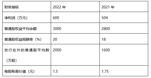 某企业有关资料如题40表所示要求:(1)计算2021年和2022年每股收益(2)采用差额分析法计算每股账面价值变动对每股收益的影响(3)采用差额分析法计算普通股权益报酬率变动对每股收益的影响