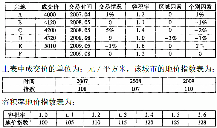 有一待估F宗地,根据最近交易的5宗地,根据以下情况试评估该土地2009年8月的价格(表中“一”号表示案例条件比待估宗地差)